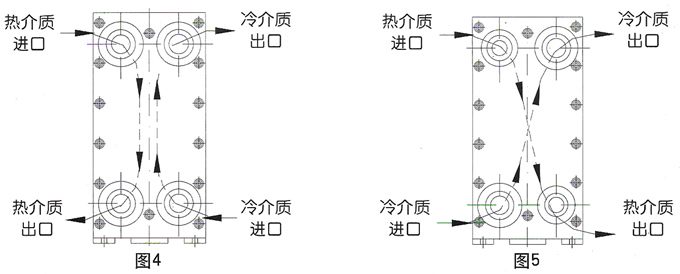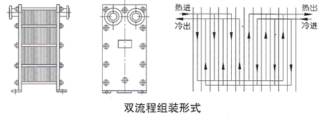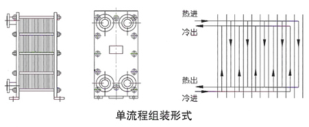 板式換熱器根據(jù)介質(zhì)的溫差和流量,可以裝配成單流程、雙流程、三流程以及多流程的形式。單流程是指介質(zhì)在換熱器內(nèi)流過一個流程,雙流程是指介質(zhì)在換熱器內(nèi)折返流過兩個過程,依次類推,各種流程的外形圖和其流程示意圖如圖3。當采用多流程時,換熱器的四個接口就不能在同一側(cè)的夾緊板上,進出口要位于前后兩個夾緊板上。