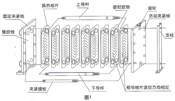 板式換熱器在裝配形式上又可分為不懸掛式(圖6)和懸掛式(圖7),不懸掛式換熱器不帶支柱,地腳板直接焊在二個夾緊板的下端,它適于重量較小的小型號的換熱器,以便在拆裝時能搬動。懸掛式換熱器帶有支柱,它拆裝時可在原位不動,活動夾緊板和換熱板片懸掛在上導桿上,可以移動,換熱板片可以拆下和裝上,較大型號的換熱器一般采用懸掛式的,以便于拆裝維修。