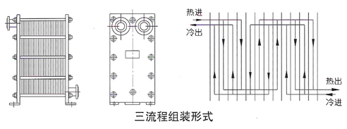 當兩種介質(zhì)的流量不同且大致為2:1且不易裝配成雙流程時,可選擇該類型的換熱器。它適用于小區(qū)集中供熱,一般一次網(wǎng)的熱水流量較小,二次網(wǎng)用戶取暖供水的流量較大的場合。